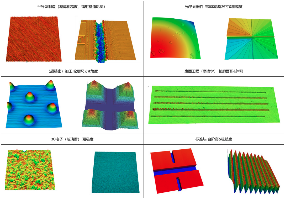 对各种产品、部件和材料表面的平面度、粗糙度、波纹度、面形轮廓、表面缺陷、磨损情况、腐蚀情况、孔隙间隙、台阶高度、弯曲变形情况、加工情况等表面形貌特征进行测量和分析。