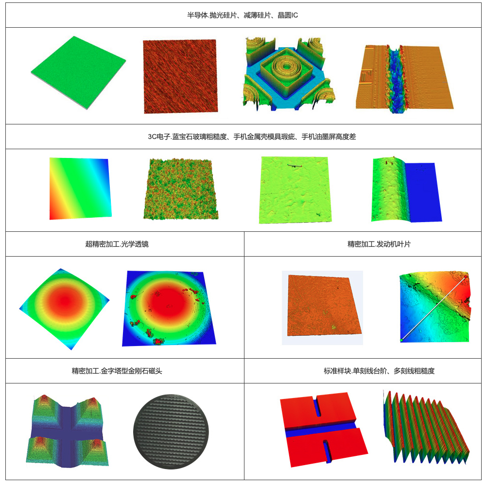 对各种产品、部件和材料表面的平面度、粗糙度、波纹度、面形轮廓、表面缺陷、磨损情况、腐蚀情况、孔隙间隙、台阶高度、弯曲变形情况、加工情况等表面形貌特征进行测量和分析。