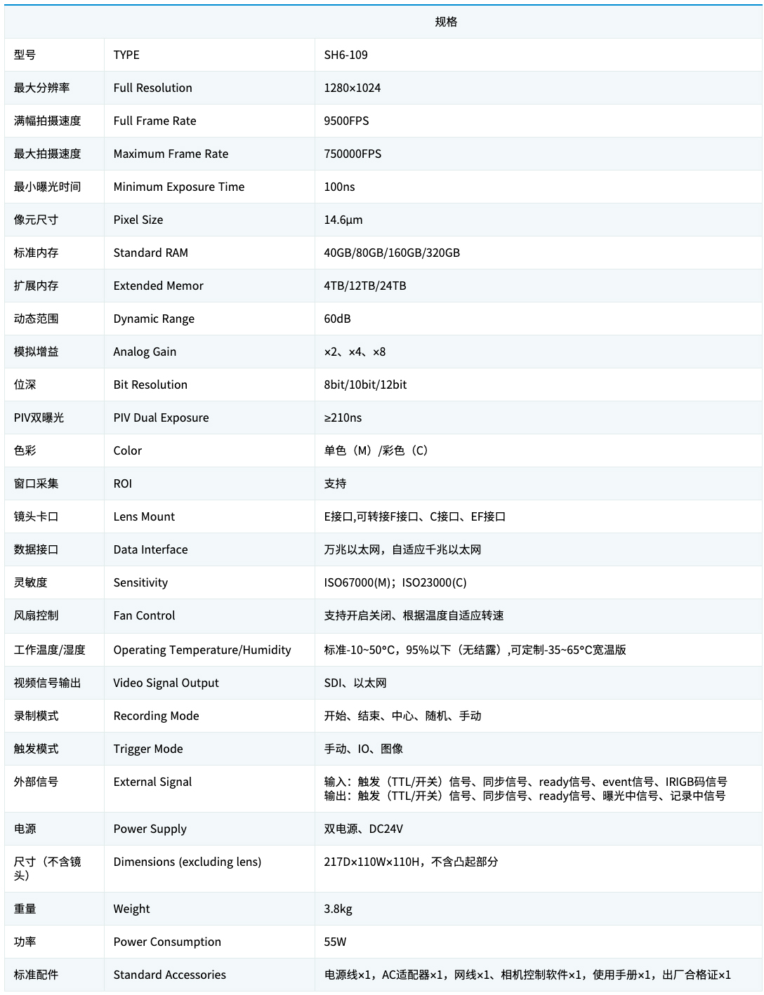 SH6-109系列是高速相机家族面向高端科研、国防军工、航空航天、高速工业等领域打造的一款功能全面的高速摄像机,继承深视产品家族的严密品控的优秀基因。通过对产品的细致打磨,无论是外观、结构,还是性能都极致呈现,不仅拥有100 Gbps的数据带宽,还支持最大20TB的可选内存,满足长时间记录需要。