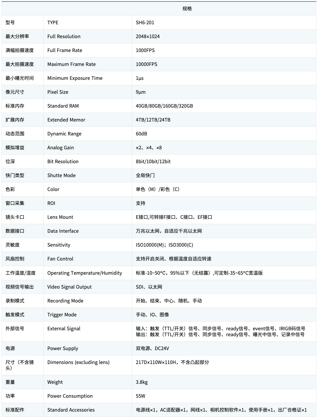 SH6-201是高速相机家族面向高端科研、国防军工、航空航天、高速工业等领域打造的一款功能全面的高速摄像机,采用了特殊定制传感器、独特的电路设计使其具备20Gbps的有效带宽和卓越的成像质量。同时,其拥有丰富的可扩展接口,让高速成像应用的有了更多可能性。